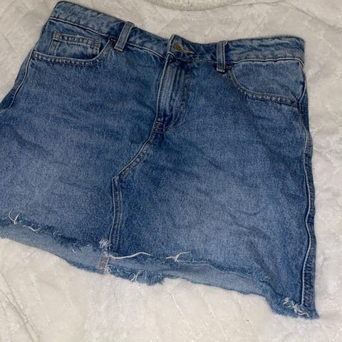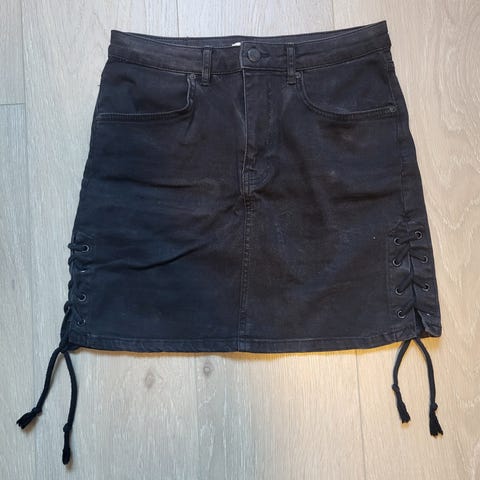 Gina Tricot dongeriskjørt for dame i størrelse 34. Skjørtet er laget i denim i svart farge. Klassisk 5-lommersmodell med beltehemper i linningen. Knappelukking foran og rå kant nederst. Passer til hverdagsbruk og kan kombineres med ulike topper og sko for et enkelt og funksjonelt antrekk.