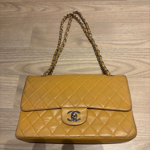Vurderes solgt. En klassisk Chanel skulderveske fra år etter 2008. Vesken har klassisk quiltet mønster, klaffelukking med metall-detaljer og dobbelt kjedestropper som kan bæres på skulder. Innvendig har vesken flere rom og glidelåslomme for organisering av eiendeler, i tillegg til sin egen organizer for å beskytte læren innvendig. Egnet til daglig bruk eller mer formelle anledninger der man ønsker en strukturert og tidløs lærveske.