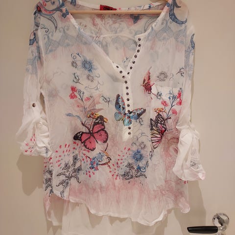 En tynn bluse med fint sommerfugl og blomstermotiv. Påsydde perler. Ermer som kan reguleres med knapp. Passer fint å ha en topp/trøye under. Bakdelen er lengre enn foran. Str er 42/44.