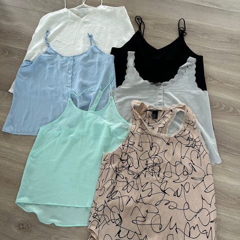 De fleste er ubrukte, noen med lapp. Merkene er Gina Tricot, Bik Bok og Suncoo. Alle er M/38 utenom den med striper. Den er str. L.