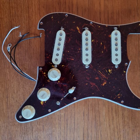 WD plekterbrett til Stratocaster HSS i hvit farge. Plekterbrettet har utsparing for én humbucker og to singlecoil-mikrofoner, samt hull for bryter og potmetere. Leveres med tilhørende pickup-deksler og tre knotter merket volume og tone. Samt 11 skruer til å skru det i gitaren. . Egnet som erstatningsdel eller oppgradering av elektrisk gitar med Stratocaster-lignende kropp og HSS-konfigurasjon.