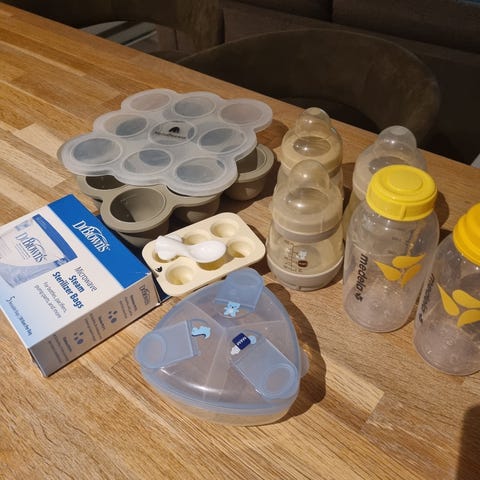 Selger en liten praktisk pakke med diverse babyutstyr. Pakken inneholder 4 stk flasker, 1 stk "fruktmos-beholder", 2 stk oppbevaringsbokser for småsnacks, grøtpulver eller MME-pulver.