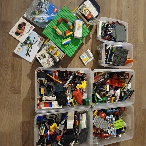 LEGO blandet klosser og figurer. Inneholder et utvalg løse LEGO-klosser i ulike farger og størrelser, sortert i bokser og poser. Det følger også med diverse minifigurer og enkelte sett-/delpakker. Egnet som påfyll til eksisterende LEGO-samling eller til fribygging og egne konstruksjoner. Alt er ikke sortert.