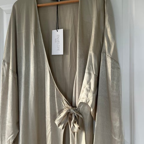 Envelope 1976 festkjole i beige viskose for dame i størrelse 40. Kjolen har lange ermer og v-utringning. Livpartiet er markert med draperte detaljer, og skjørtet faller rett ned i full lengde. Materialet er lett og har en diskret struktur i stoffet. Egnet som penkjole til formelle anledninger og festbruk.