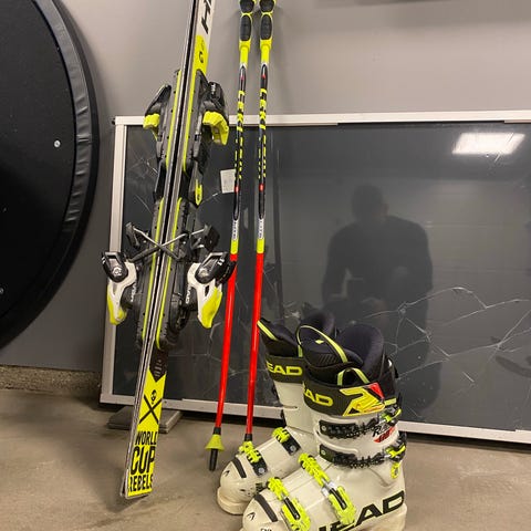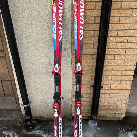 Elan slalomski, carving, lengde 181 cm. Salomon bindinger. Dolomite slalomstøvler str. 43. Swix staver, lengde 126 cm.