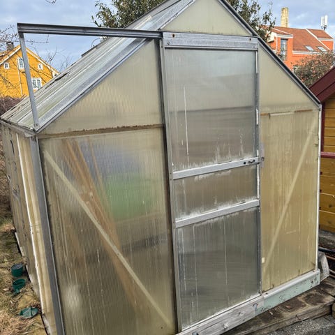 Lite drivhus i aluminium og transparent plast/polykarbonat. Drivhuset har skrått tak med åpningsvindu og skyvedør i front. Egnet for plassering inntil vegg, og gir beskyttet miljø for dyrking av planter, frø og små grønnsaker.