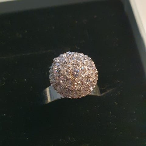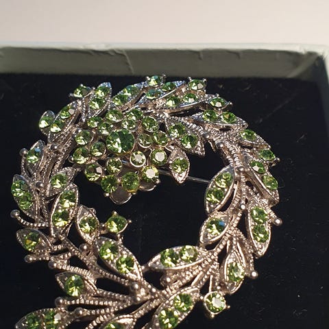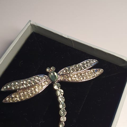 Damebrosje med krystaller. Brosjen har rund form med flere klare krystaller i ulike størrelser på forsiden. Festes med nål og lås på baksiden. Passer som tilbehør til jakker, kåper, blazere eller sjal.