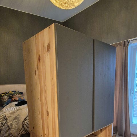 IKEA Ivar skap furu malt i fargen balanse fra Jotun. Med bein 17 cm. Beina kan lett skrus av. høyde med bein 100 cm. Bredde 80 cm, dybde 30 cm.