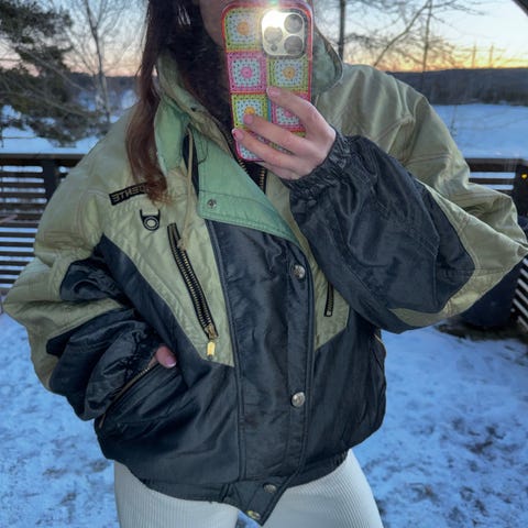 Rosa afterski jakke. Glidelåsen på den ene lomma funker ikke, ellers i god stand! Vintage og retro!