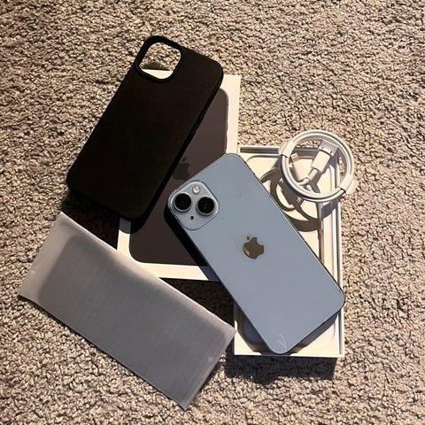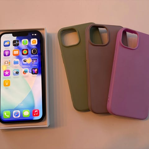 Selger min iPhone 14 128 gav i blå. Telefonen er vel godt brukt men har mye liv igjen, mye baksiden er litt knust men med deksel har det ikke mye å si. Den har litt hacker og riper. Batterien ligger på 87%