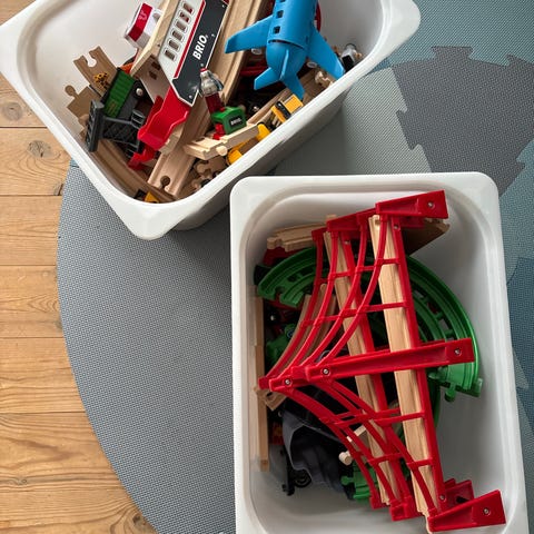 BRIO togbane trelekesett med tog, helikopter og tilbehør.