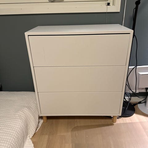 Lav kommode med to skuffer fra IKEA selges. Fremstår pent brukt. Et knappenålshull på toppen av platen og ved øverste håndtak men knapt mulig å se. Stått på gjesterom. Må hentes.