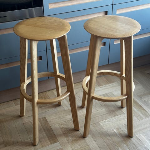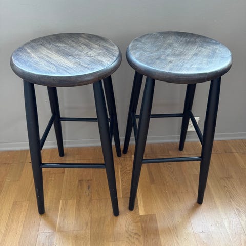 Den ene har et avlangt hakk i treverket som var der når jeg kjøpte den.