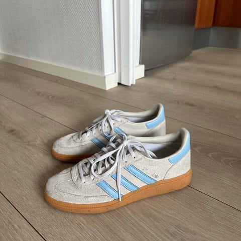 Adidas sneakers joggesko i størrelse 37. Modellen er i blå farge med hvite striper og mørk såle. Overdelen ser ut til å være i semsket materiale med snøring foran. Yttersålen er i gummi med mønster for grep. Passer til hverdagsbruk og fritidsaktiviteter.