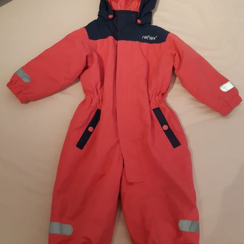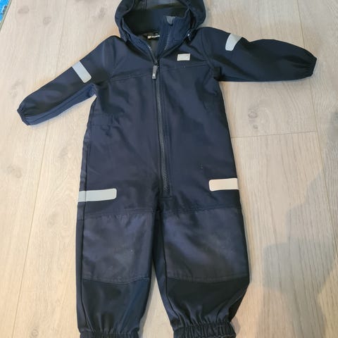 Myk og lett parkdress i str 80 (kanskje mer som en 86) har hette med fleezekant, glidelås og knappelukking foran, samt strikk i livet for bedre passform. Benavslutningene har strikk og fotstrikker for å holde dressen på plass. Perfekt for barn i barnehage og utelek.