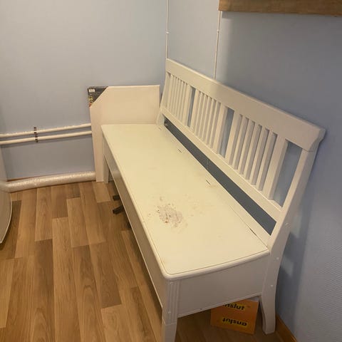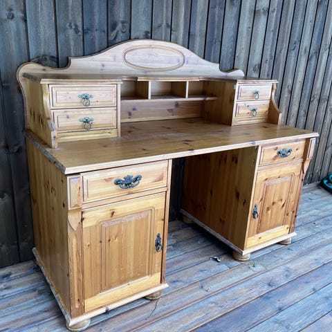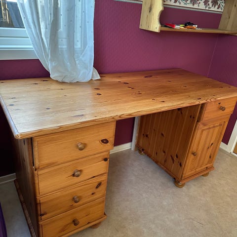 Skrivepult i lutet furu. Noe bruksmerker. En skuffe har løs front