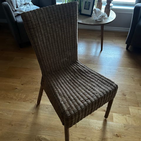 Stolen er stabil og fullt brukbar. Noe normal bruksslitasje i flettingen enkelte steder, men ingen strukturelle skader.