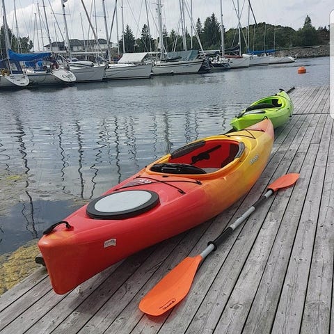 Pent brukt tredelt kajakk. Enkelt sete med polstret rygg og åpen cockpit. Medfølgende svart spruttrekk fra HKO og to-delt åre med gule blad og svart skaft. Kajakken har strikk på dekk foran for feste av utstyr, samt rund oppbevaringsluke foran og bak. Egnet for én person til padling på sjø eller innsjø, avhengig av brukerens behov og ferdighetsnivå.