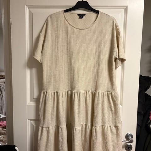 Monki hverdagskjole for dame i størrelse M. Kjolen er svart og laget i polyester. Modellen har rund hals, 3/4-lange ermer og strikk i midjen som gir en lett innsvinget fasong. Lengden går omtrent til leggen, avhengig av høyde. Egner seg til hverdagsbruk og enkle anledninger.