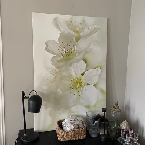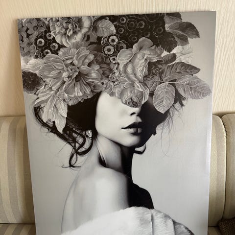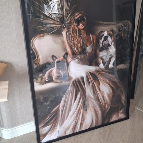 Bildet viser en stilisert og melankolsk kvinne i rød kjole mot lys bakgrunn. Innrammet i enkel, mørk rektangulær ramme, klart til oppheng på vegg i stue, gang eller soverom. Ca 95 x 25 cm , dekorativt