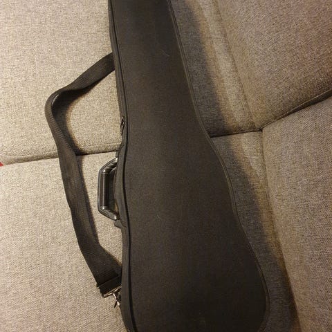 Fiolin med bue og etui. Instrumentet har brunt treverk og mørk gripebrett. Det følger med bue som oppbevares i etuiet, samt et hardt futteral med bærehåndtak og innvendig polstring. Passer til øving og spill hjemme, på skole eller i korps/orkester. Størrelse og merke er ikke oppgitt og bør eventuelt kontrolleres ved interesse.