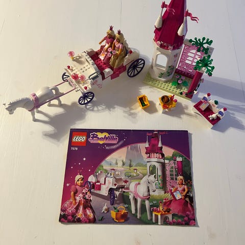 LEGO Belville prinsesse på erten byggesett. Settet inkluderer prinsessefigur med rosa kjole, seng med tekstilsengetøy, port, lite tårn og diverse små tilbehør som hund og børste. Manual medfølger men ikke esken.