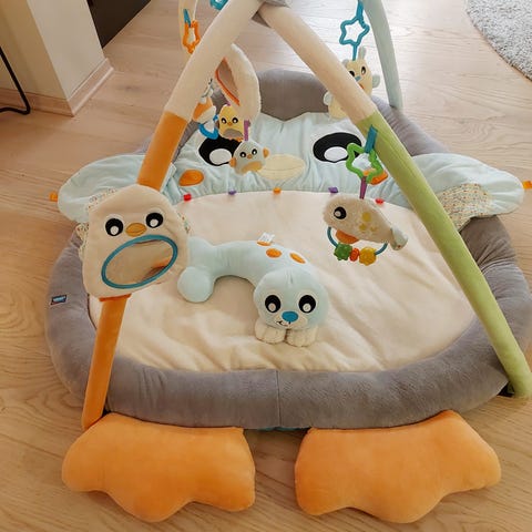 Matta og lekene kan vaskes i maskin, og er nyvasket.
