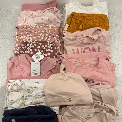 Pakken består av en nydelig buksedress og to bukser og en body fra Newbie, et ganmelrosa sett og en genser fra H&M, samt sokker og strømpebukser fra Newbie. Klærne er pent brukt av ett barn.