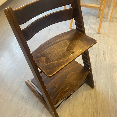Brun stokke tripptrapp stol. Den er pent brukt, foruten merke øverst på stolen (se bilde).
