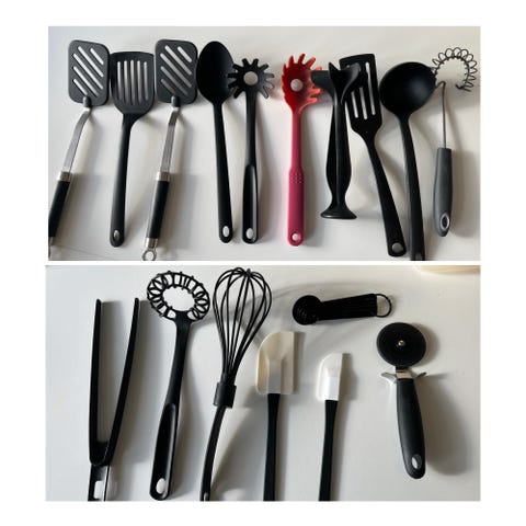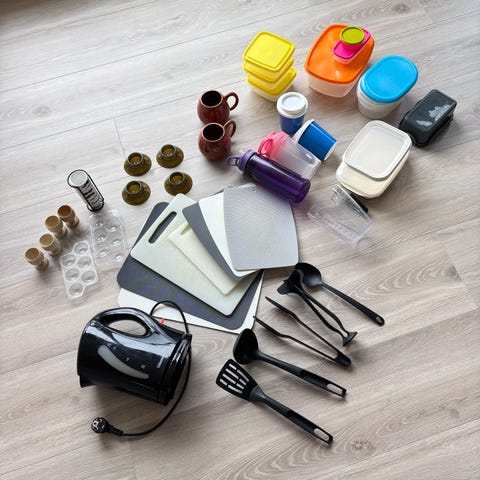 Inneholder: skjærebrett, boller, isbit form, pizza brett, grønnsaks kutter, litermål, matboks, oppbevarings boks, stekespade og andre kjøkkenutstyr.