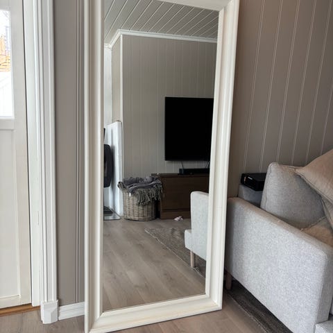 Rektangulært speil med bred, profilert ramme. Kan brukes som helfigurspeil i for eksempel gang, soverom eller garderobe. Rammen har noen synlige merker og slitasje, som vist på bildene.