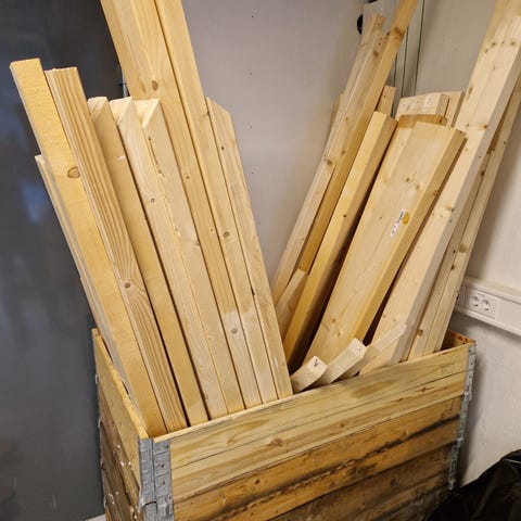 Blandet parti med trepaller og annet treverk egnet til gjenbruk. Inneholder ulike typer og størrelser paller og trekonstruksjoner. Kan brukes til ved, lagring, transport eller som råmateriale til egne bygge- og gjør-det-selv-prosjekter. Gis bortsamlet etter avtale om mengde og henting.