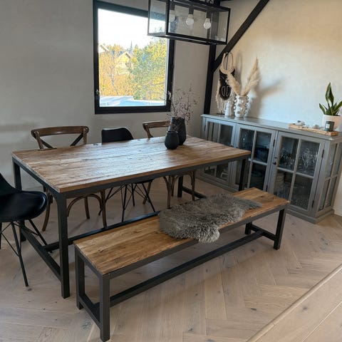 Spisebord og benk i heltre eik fra Home and Cottage selges. Solid, fint og slitesterkt bord. Pent brukt, men noe synlig merker av bruk. Se bilder.