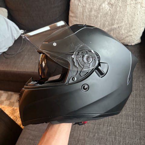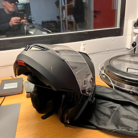 Schuberth MC-hjelm av typen åpningshjelm i matt svart farge C3. Størrelse L (58-59). Hjelmen har klart visir og integrert solskjerm (basert på typisk Schuberth-konstruksjon), samt ventilasjon på toppen og foran. Innvendig har hjelmen polstret og avtakbart fôr. Vet ikke helt om intercom fungerer helt, men regner med at den kun trenger lading. Har også noen riper i visiret, så det burde kjøpes nytt.