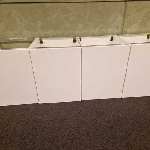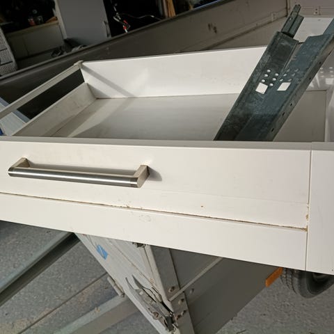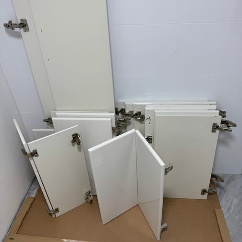 Kjøkkeninnredning med skap og skuffer i kombinasjon av hvite fronter og fronter i trelook. Løsningen består av både overskap og underskap, samt flere brede skuffer. Noen fronter har horisontale trepaneler, mens andre er glatte hvite. Det følger med håndtak montert på frontene. Innredningen kan brukes som komplett kjøkken eller som ekstra oppbevaringsløsning i for eksempel vaskerom, bod eller garasje. Innredning er demontert og er lagret tørt.