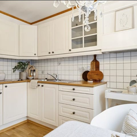 Kjøkkeninnredning skap og skuffer hvit og trefiner - stort kjøkken