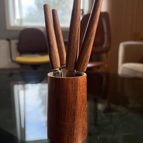 Local Chef holder til kjøkkenrull i Alaska tre. Sylindrisk form med åpning i siden. Undersiden har filtputer for stabilitet og for å beskytte underlaget. Produktet er FSC-merket treverk. Ble aldri brukt. Kjøpt i desember 2025.