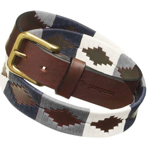 Pampeano belte i skinn. Beltet er laget i brunt lær med flerfarget vevd mønster i midtpartiet. Lengden er merket 105. Passer til bruk i bukser eller jeans, og kan brukes til både hverdags- og fritidsantrekk.