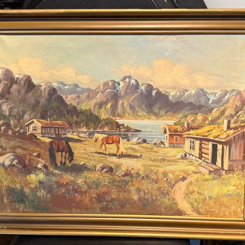 landskapsmaleri som viser en fjellgård med flere tømmerhus, gjerder og vei i et dal- og fjellandskap. I bakgrunnen sees høye fjell og skogkledde åser, mens forgrunnen har tun, steingjerde og innhegning. Bildet er signert nede i høyre hjørne og datert 1951. Maleriet er innrammet i en profilert ramme i nøytral fargetone. Egner seg som veggdekor i stue, hytte eller andre rom der man ønsker et motiv med norsk natur og tradisjonell gårdsbebyggelse.
