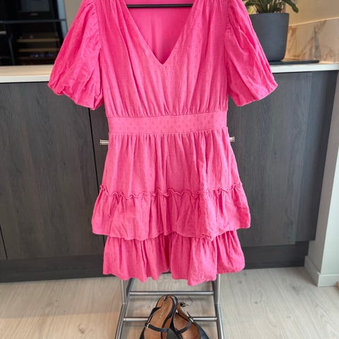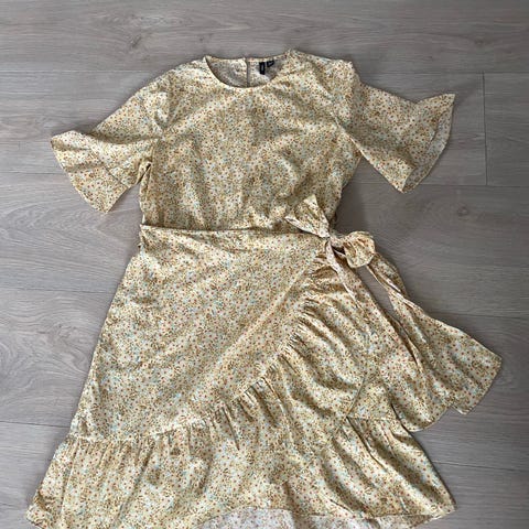 Vero Moda sommerkjole for dame i størrelse M. Kjolen er hvit og laget av viskose og elastan. Den har kort lengde, omslagsoverdel med knyting i siden og korte puffede ermer. Passer til bruk på varme dager eller til enkle hverdags- og sommeranledninger.