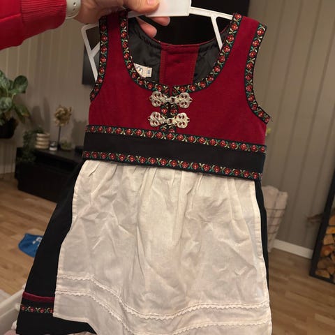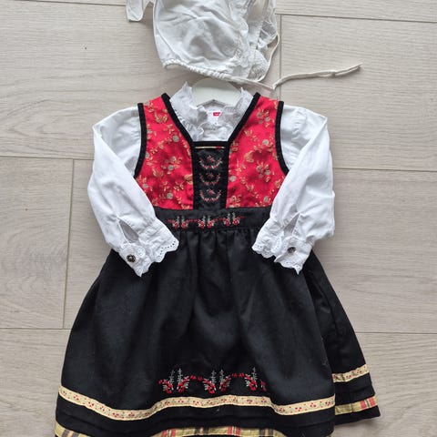 Komplett festdrakt for jente i størrelse 74. Kjole med rød vest, vevet kantebånd og hempelukning, tradisjonspreget utseende med sølvfargede spenner foran. Stakk med vevet kantebånd nederst. Bomullsforkle med belte som enkelt justeres med borrelåslukning. Medfølgende body er produsert i 100% bomull og har trykknapp lukning i kilen.