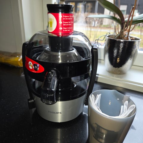 Kenwood juicemaskin i hvit plast med transparent topp og integrert beholder for juice. Maskinen har innmatingsrør på toppen og rustfritt stål-filter for pressing av frukt og grønnsaker. Egnet til tilberedning av fersk juice hjemme på kjøkkenet. Enheten har strømledning med jordet støpsel og avtakbare deler som kan tas ut for rengjøring. Passer til vanlig bruk i husholdning for pressing av ulike typer frukt og grønnsaker.