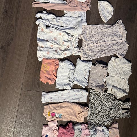 4 bodyer, 2 strømpebukser, 3 bukser, 6 pysjer og en del sokker.