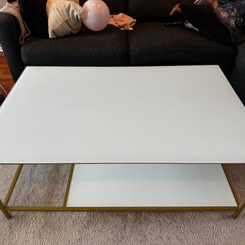 Sofabord hvitlakkert herdet glass, messingfarga understell.