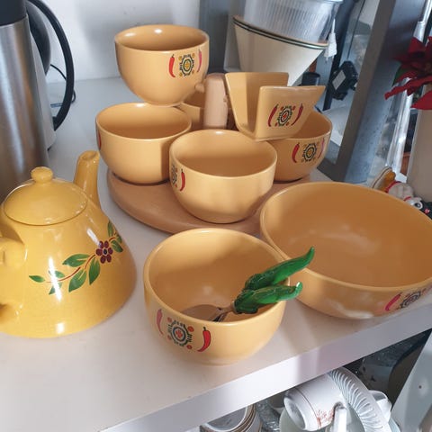 Selger et komplett og unikt taco servise. 18 tallerkner ,boller på snurrebrett, store boller, lefsevarmer, tacokjøttvarmer og diverse annet. Noen av tallerknene er litt ulike men går fint sammen. De fleste er like