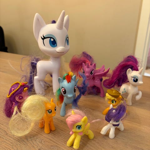 My Little Pony figurer i plast i ulike farger. Settet består av flere ponni-figurer med vinger og/eller horn og langt, flerfarget hår som kan børstes og styles. Figurene har ulike kroppsfarger og detaljer på sidene. Egnet som leker for barn eller som samlefigurer for My Little Pony-universet.