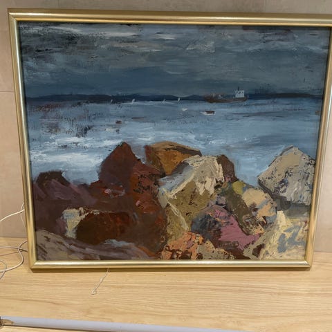 Nydelig Inger K. Giskeødegård maleri. Motiv Molja, Brosundet mot Godøyfjellet. 105 cm x 105 cm.