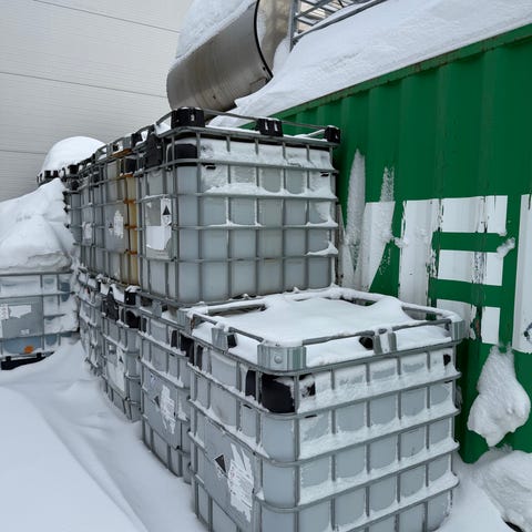 IBC tank plastbeholder med kapasitet på ca. 1000 liter. Beholderen står i metallbur på pall for enkel håndtering og lagring. Egnet til oppbevaring og transport av væsker der dette er tillatt. Farge: hvit, med rød skrukork på toppen. Materiale: plastbeholder med metallramme og pallunderstell.