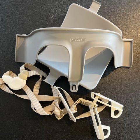 Stokke Tripp Trapp spisebrett og bøyle til barnestol. Settet består av et gjennomsiktig plastbrett og en hvit plastbøyle som festes på stolen. Delene er laget for å gi barnet en egen spise- og lekeplass på Tripp Trapp-stolen. Passer til Stokke Tripp Trapp.
