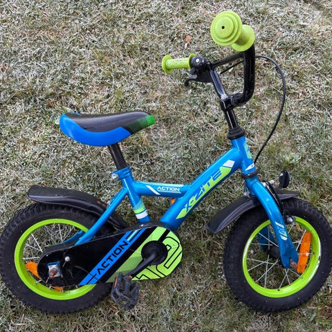 White barnesykkel 12" i blå og grønn farge. Sykkelen har 12-tommers hjul, rette styre med grønne holker og ringeklokke. Den er utstyrt med kjedekasse, skjermer foran og bak samt vanlig sete. Passer for mindre barn som skal lære å sykle eller bruke sykkel til korte turer og lek.